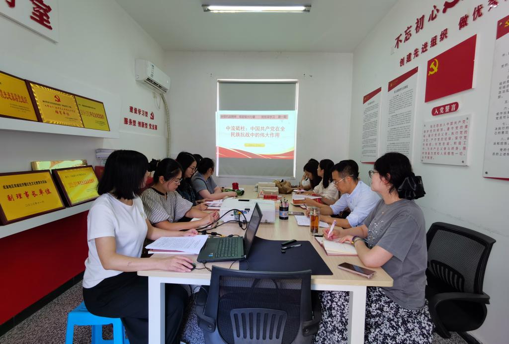 为引导全体教师准确把握抗日战争的历史进程、伟大意义和经验启示,自觉将伟大抗战精神融入教育教学和师德师风建设,9月19日,马克思主义学院教工第一党支部在学院302会议室开展了“赓续抗战精神 砥砺复兴力量”系列微党课第一期,主题为“中流砥柱:中国共产党在全民族抗战中的伟大作用”。支部全体党员教师参加了学习。
