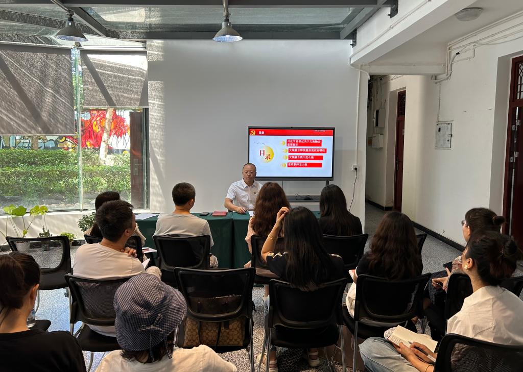 会上,马克思主义学院院长张宗胜以文旅融合的概念、核心内涵、实现途径为切入点,分别从“习近平总书记关于文旅融合重要指示、文旅融合释放叠加效应、四川省委十二届七次全会关于四川文旅融合的举措、以及思政教师在文旅融合大潮中应该怎么做”四个层面系统阐述了如何推动文旅融合高质量发展、释放更多叠加效应。并鼓励老师们深入文旅融合大潮,通过创新教学模式、整合教育资源、强化实践教育等方式,推动思政教育与文旅产业深度融合、培养德才兼备的文旅人才。