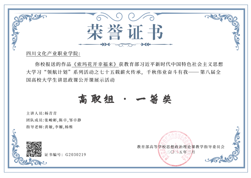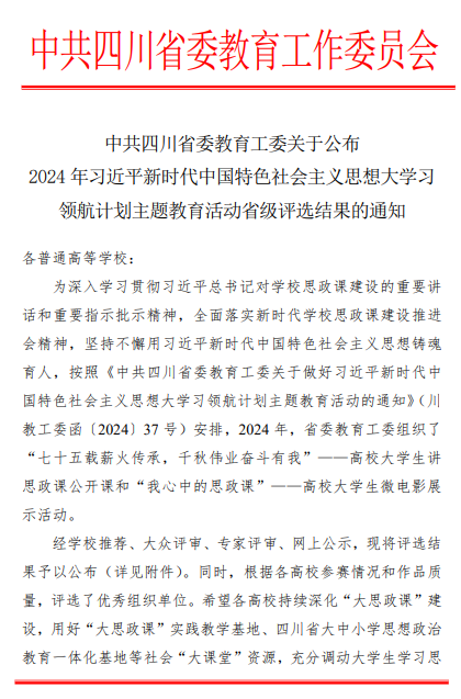 近日,中共四川省委教育工委公布了2024年习近平新时代中国特色社会主义思想大学习领航计划主题教育活动的省级评选结果。我校马克思主义学院表现卓越,两部作品《索玛花开幸福来》和《传承·圆梦》分别荣获省特等奖和省二等奖。同时,《索玛花开幸福来》亦获得全国一等奖。