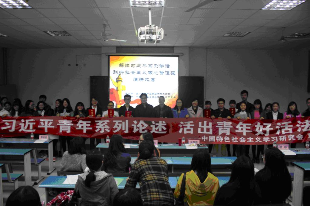 下午,由我校思政部主办,中国特色社会主义理论学习研究会社团承办的“解读习近平对青年系列讲话,践行社会主义核心价值观”演讲比赛在第二教学楼405教室隆重举行。