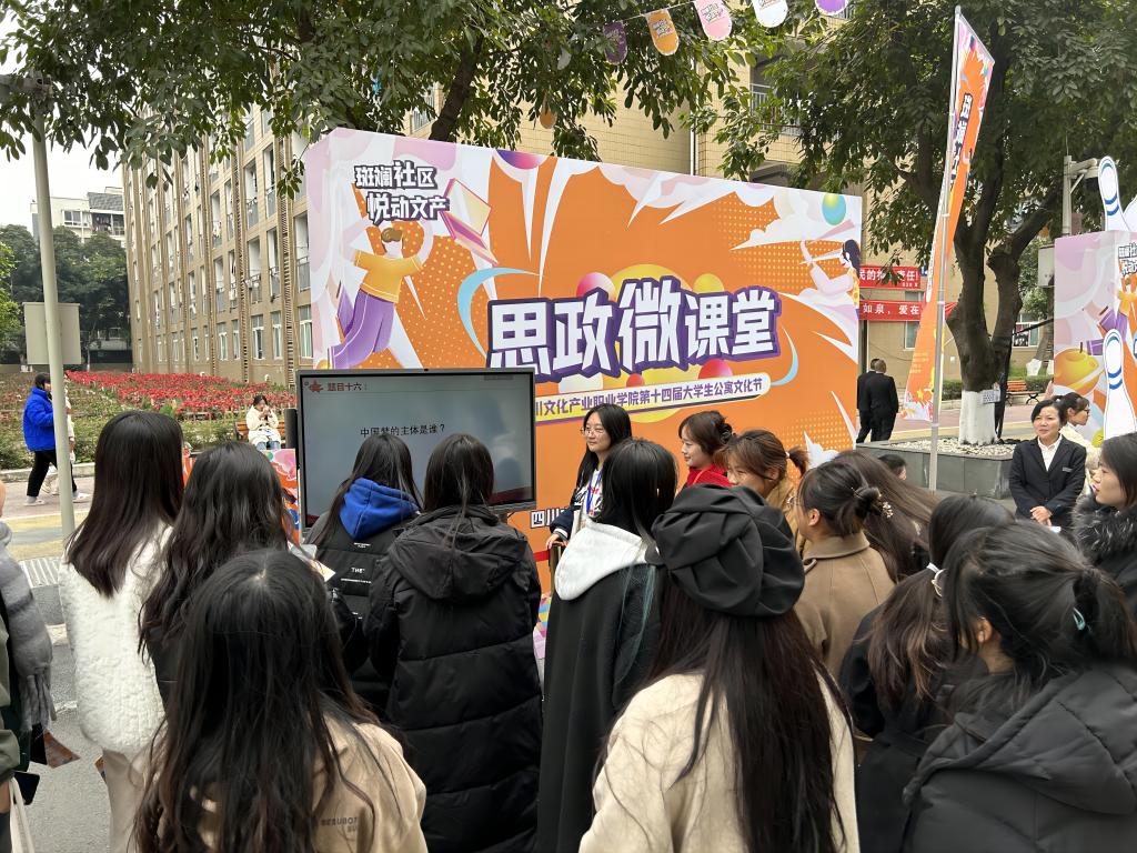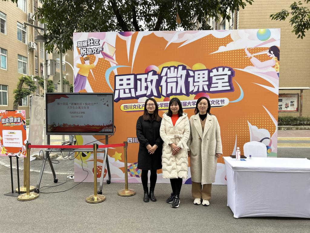 2023年12月,以“斑斓社区·悦动文产”为主题的第十四届大学生公寓文化节在女生公寓举办。由马克思主义学院主办的“思政微课堂”是公寓文化节的重要组成部分,马克思主义学院党总支副书记马吉宏,马克思主义学院教师代表孙世欣、程蓓蓓及新时代中国特色社会主义思想学习会学生参加了此次活动。