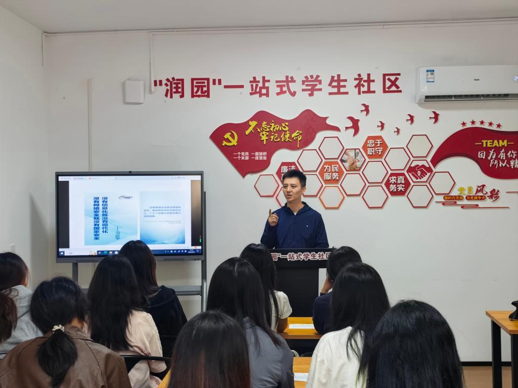 党员教师、律师钱箐,以公司数据泄露导致千万用户信息外泄等典型案例为切入点,从网络空间主权、安全与发展并重、共同治理三大核心原则为学生解读了《中华人民共和国网络安全法》。同时,介绍了《国家网络安全事件报告管理办法》,提醒学生在使用网络时要遵守法律法规。