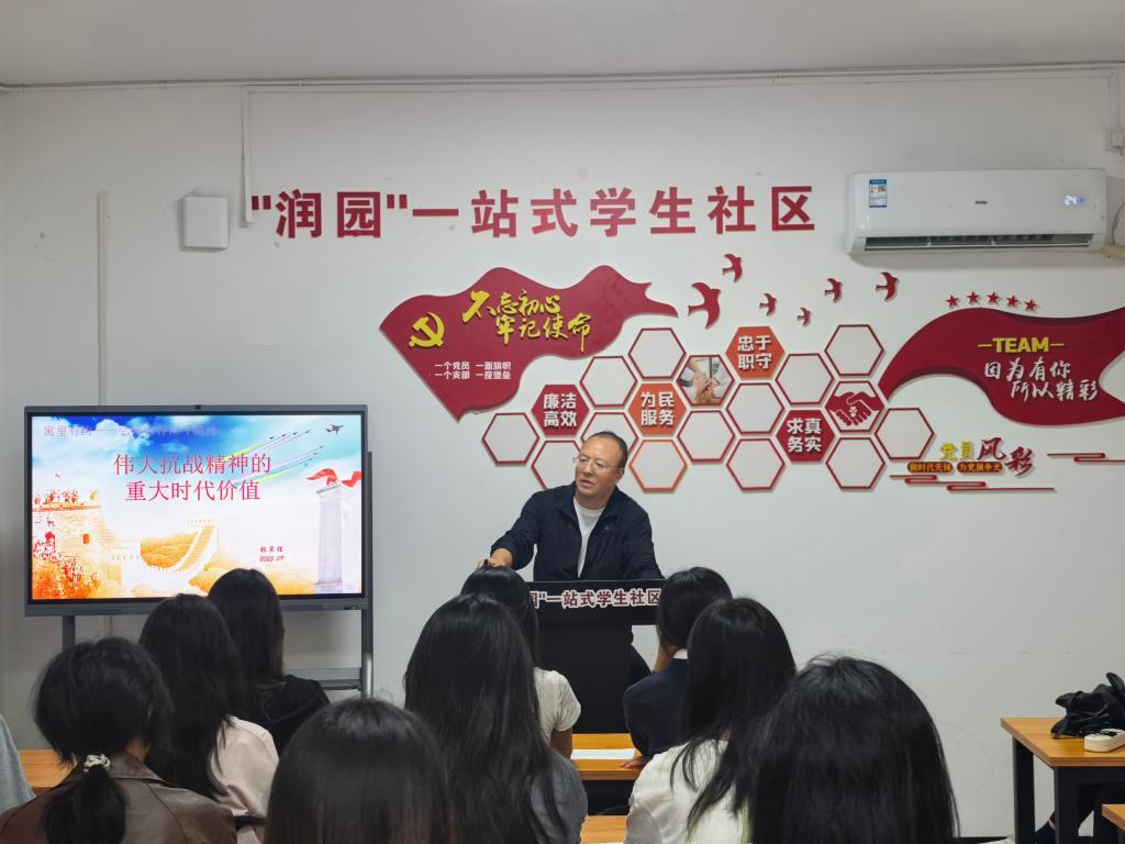 院长张宗胜以“伟大抗战精神的重大时代价值”为主题,从抗战小故事、伟大的抗战精神和伟大抗战精神的时代价值三个方面给同学们分享了一堂生动的微党课。他表示,勿忘昨天的苦难辉煌、无愧今天的使命担当、不负明天的伟大梦想,希望同学们能践行青年的使命与担当,在青春的接续奋斗中书写辉煌的明天。